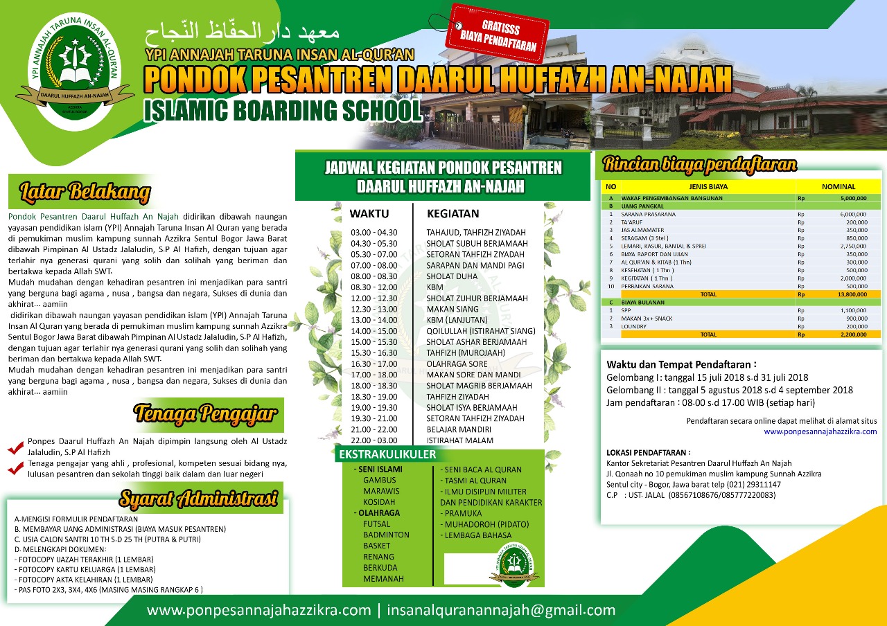 Biaya masuk pesantren al itqon bogor, biaya masuk untuk sekolah asrama tergantung pada jenis pesantren yang Anda pilih. Sekolah boarding Islam modern dengan kelas internasional menawarkan SPP ke biaya masuk Pesantren modern, berapa juta? Untuk Paten Paten yang ingin anak-anak mereka merasakan pendidikan pesantren dengan kurikulum saat ini. Nunggung Bogor Regency Jawa Barat Jenis: Al Inaayah Islamic Boarding School terletak di Rawakalong Gunung Sindur Bogor.